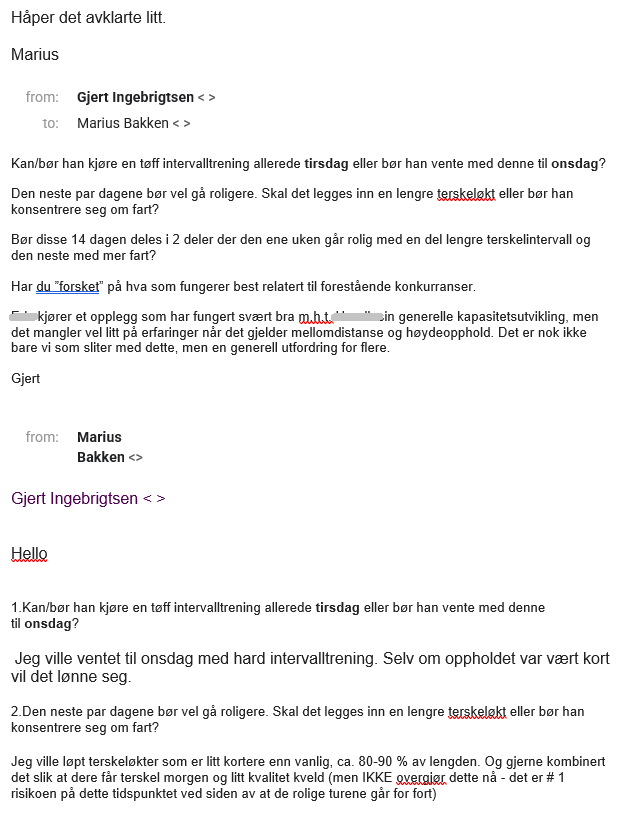 Translation : Bakken runs 180 km weekly, few runners run more.. “- within a single given time-frame the body is receptive for hard training. So it is a matter of finding how long this time-frame is, and utilizing it to the maximum” .. “-in this receptive period, I place in there two to three hard workouts instead of the normal approach of one easy + one hard. It means that instead of three hard workouts a week, it is possible to double the load of threshold training.. ” ..”-I feel as fresh at the end of a week with this system as I would by the regular approach and only three hard workouts weekly”