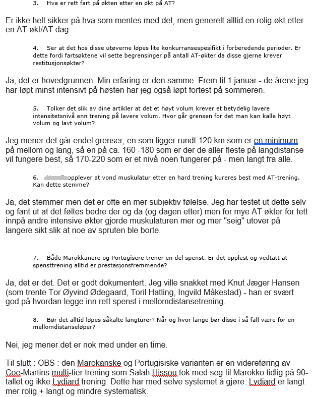 At the time, the various elite Norwegian training groups had a wide variety of training approaches, ranging from pure Lydiard training to more intense Martin/Coe type of training.