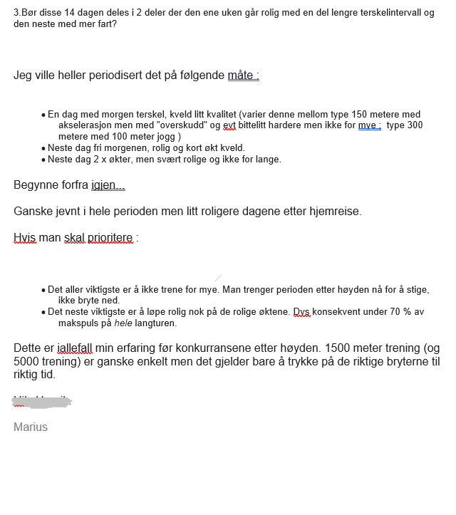 Due to my studies, I had to concentrate the number of training days at altitude, in particular late in my running career. I would then travel for 7-8 day trips to South Africa, and do double threshold on day 1+3+5 and 7, before going back to Norway and the regular post-altitude cycle of more easy work with a clear benefit on the anaerobic threshold speed.